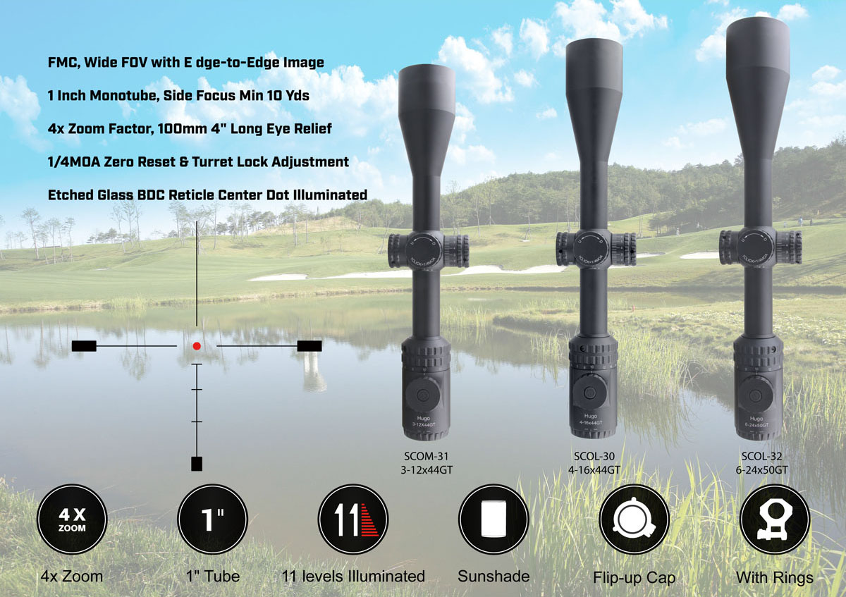 • 1/4MOA Zero Reset & Turret Lock. Etched Glass BDC Reticle. Center Dot Illuminated.